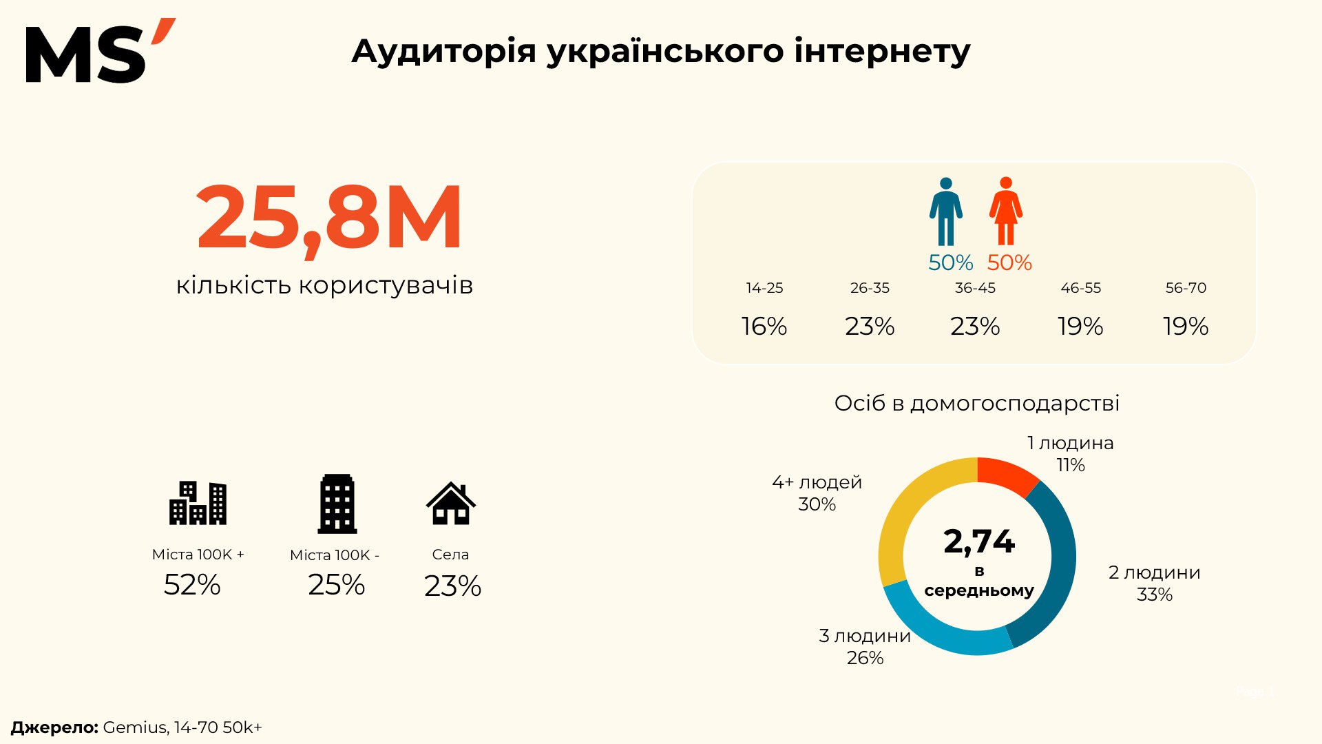 Сьогодні аудиторія українського інтернету налічує 25,8 млн користувачів — це майже кожен другий житель країни у віці від 14 до 70 років. Вона рівномірно розподілена за статтю: 50% чоловіків і 50% жінок, що підтверджує універсальність цифрового простору як середовища для комунікації, навчання та розваг.
