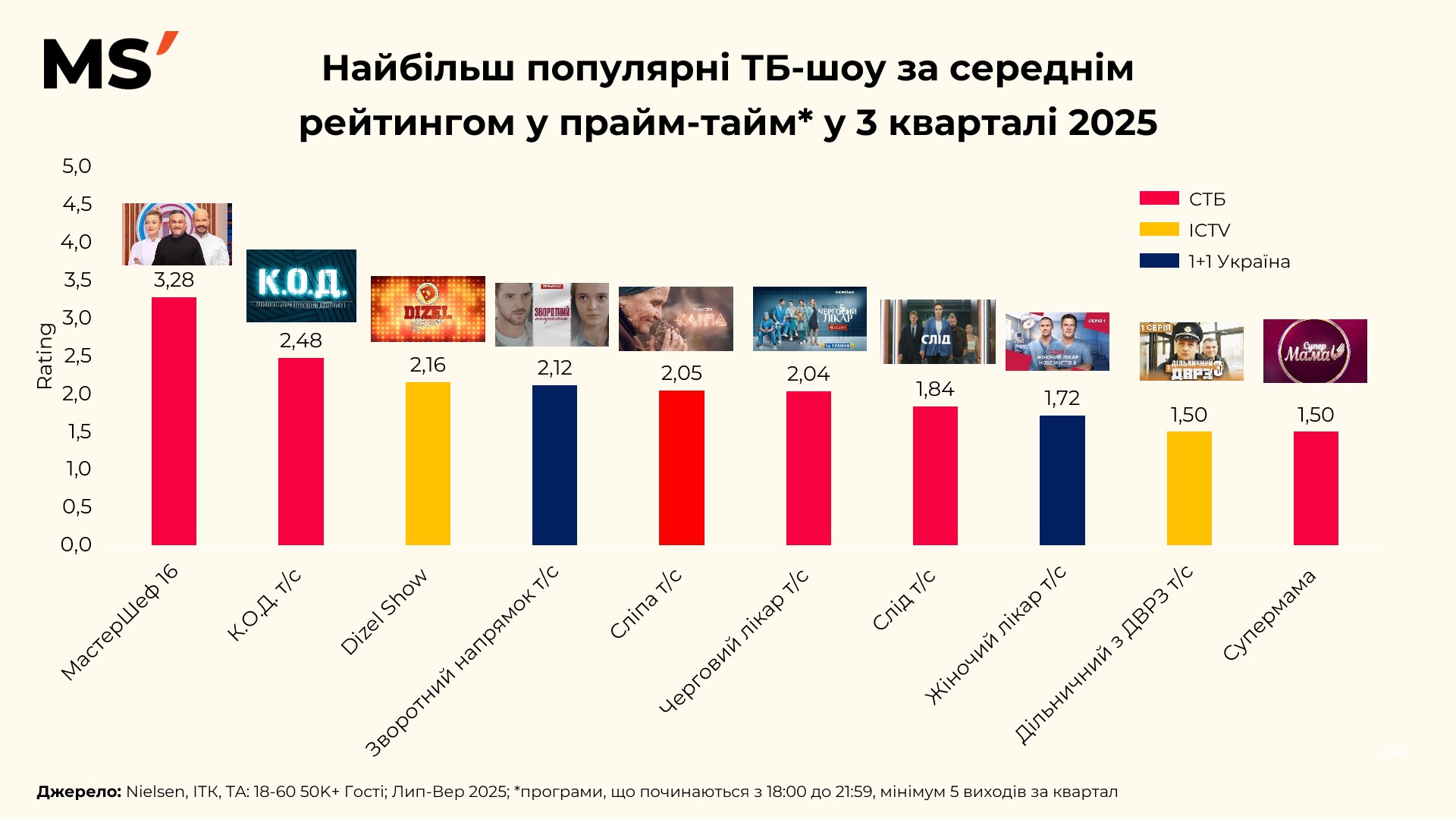 У прайм-таймі 3 кварталу 2025 року український глядач чітко визначив свої фаворити — і це важливий сигнал для брендів, які планують рекламну присутність у телеефірі. Абсолютний лідер — «МастерШеф 16» зі середнім рейтингом 3,28. Це не просто кулінарне шоу, а зразок емоційного контенту, який поєднує розвагу, конкуренцію та сильний storytelling — і створює соціальний «ефект перегляду разом».