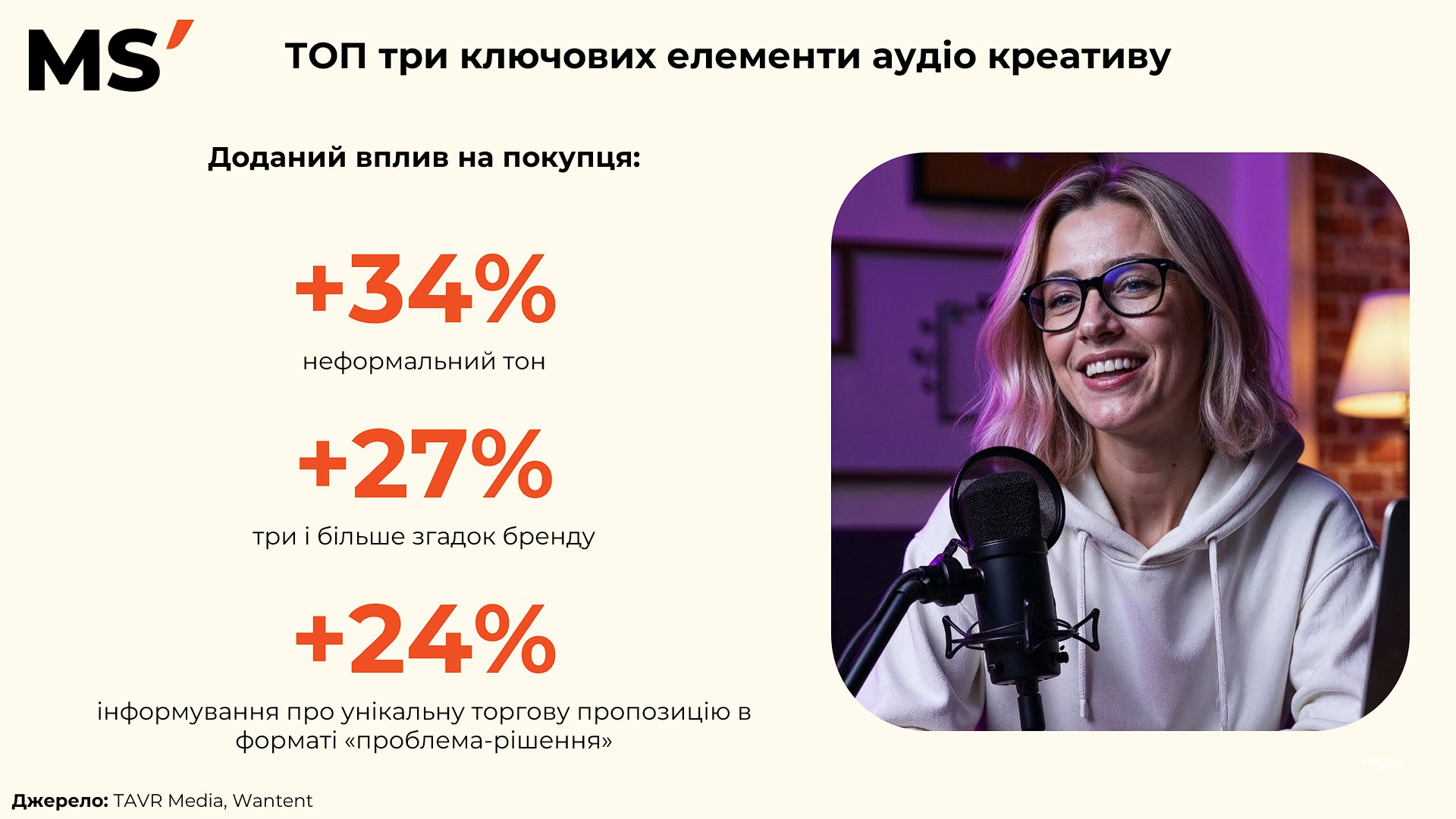 Третій елемент — інформування про унікальну торгову пропозицію у форматі “проблема-рішення”. Такий підхід додавав +24% до наміру покупки. Слухачі краще реагували, коли реклама чітко пояснювала, яку проблему вирішує продукт і яку вигоду він приносить.