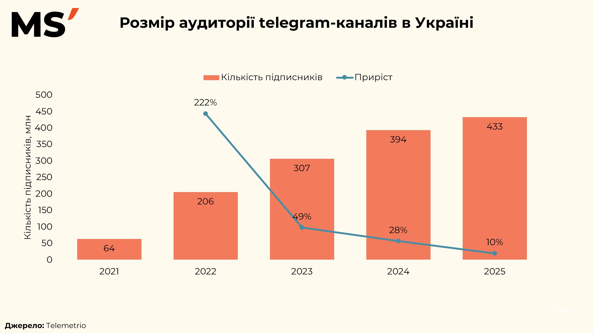 У 2023 році зростання продовжилося, але стало більш стриманим: аудиторія збільшилась до 307 млн підписників, а темп приросту знизився до +49%. У 2024 році Telegram додав ще майже 90 млн підписників, досягнувши 394 млн, при зростанні +28%. А у 2025 році загальна аудиторія перевищила 430 млн підписників, однак річний приріст склав лише +10%.