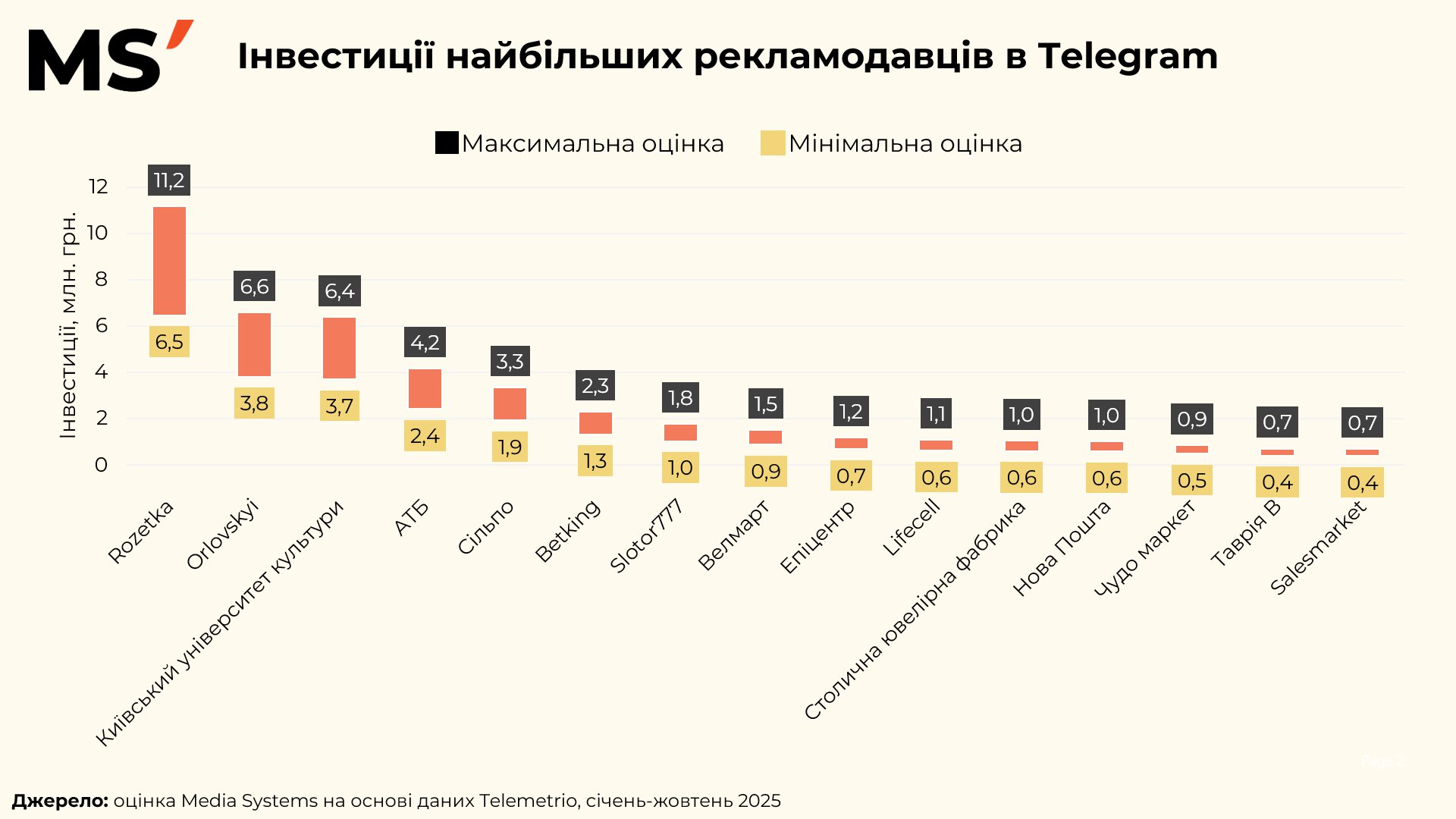 Якщо подивитися на інвестиції, картина стає ще показовішою. Rozetka інвестує в Telegram від 6,5 до 11,2 млн грн, формуючи найбільший рекламний тиск у середовищі. Orlovskyi та Київський університет культури перебувають у діапазоні 3,7–6,6 млн грн, тоді як більшість інших брендів працюють у коридорі до 4 млн грн. Це свідчить не лише про різний масштаб бюджетів, а й про різні ролі Telegram у медіаміксі: від каналу іміджу до інструменту стабільного перформансу.