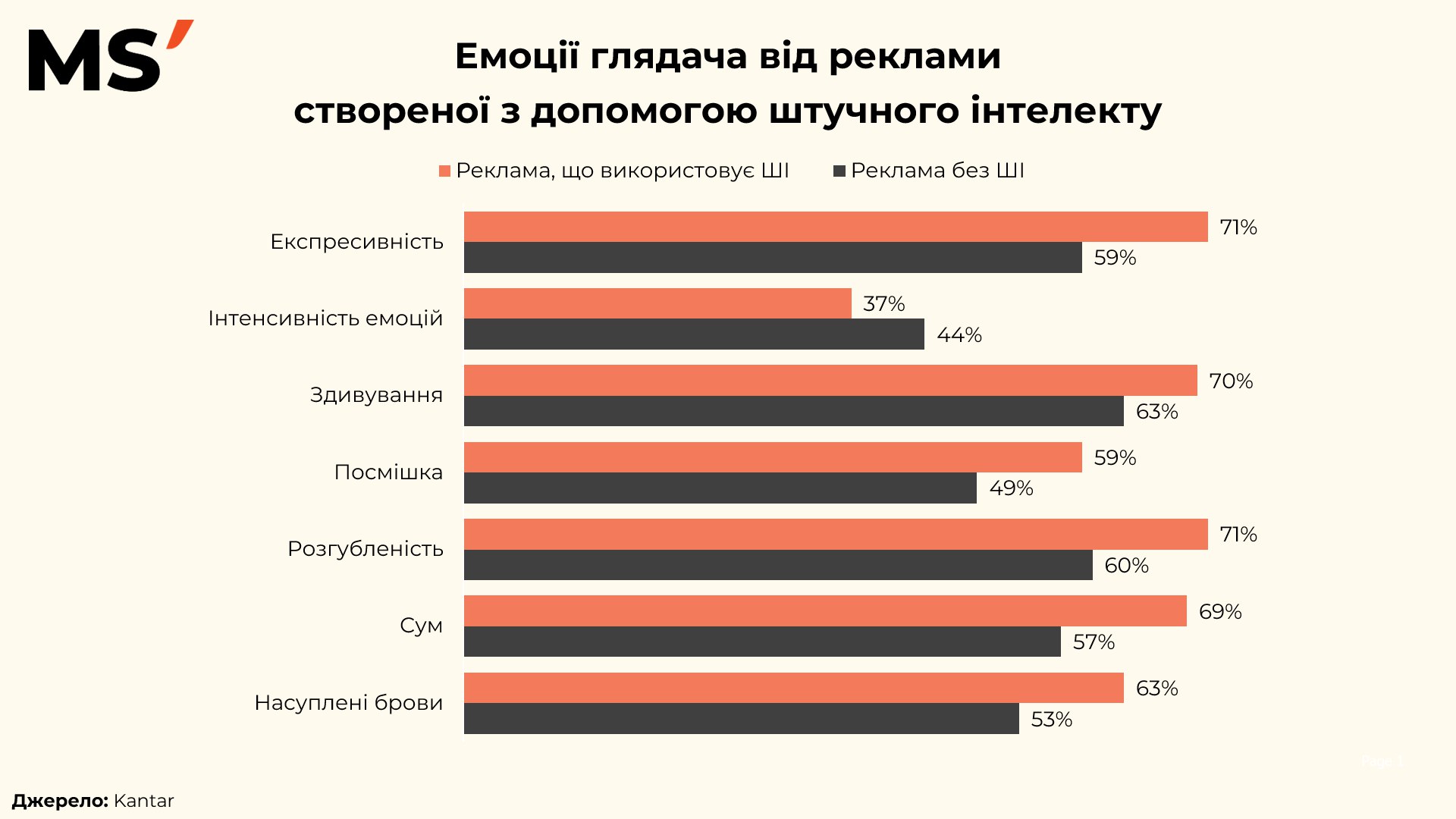Реклама, створена за допомогою штучного інтелекту, майже за всіма емоційними показниками випереджає креативи без ШІ. Наприклад, рівень експресивності у таких роликів сягає 71% проти 59% у традиційній рекламі. Здивування також виникає частіше — 70% проти 63%, а посмішку ШІ-креативи викликають у 59% глядачів, тоді як без ШІ — у 49%.
