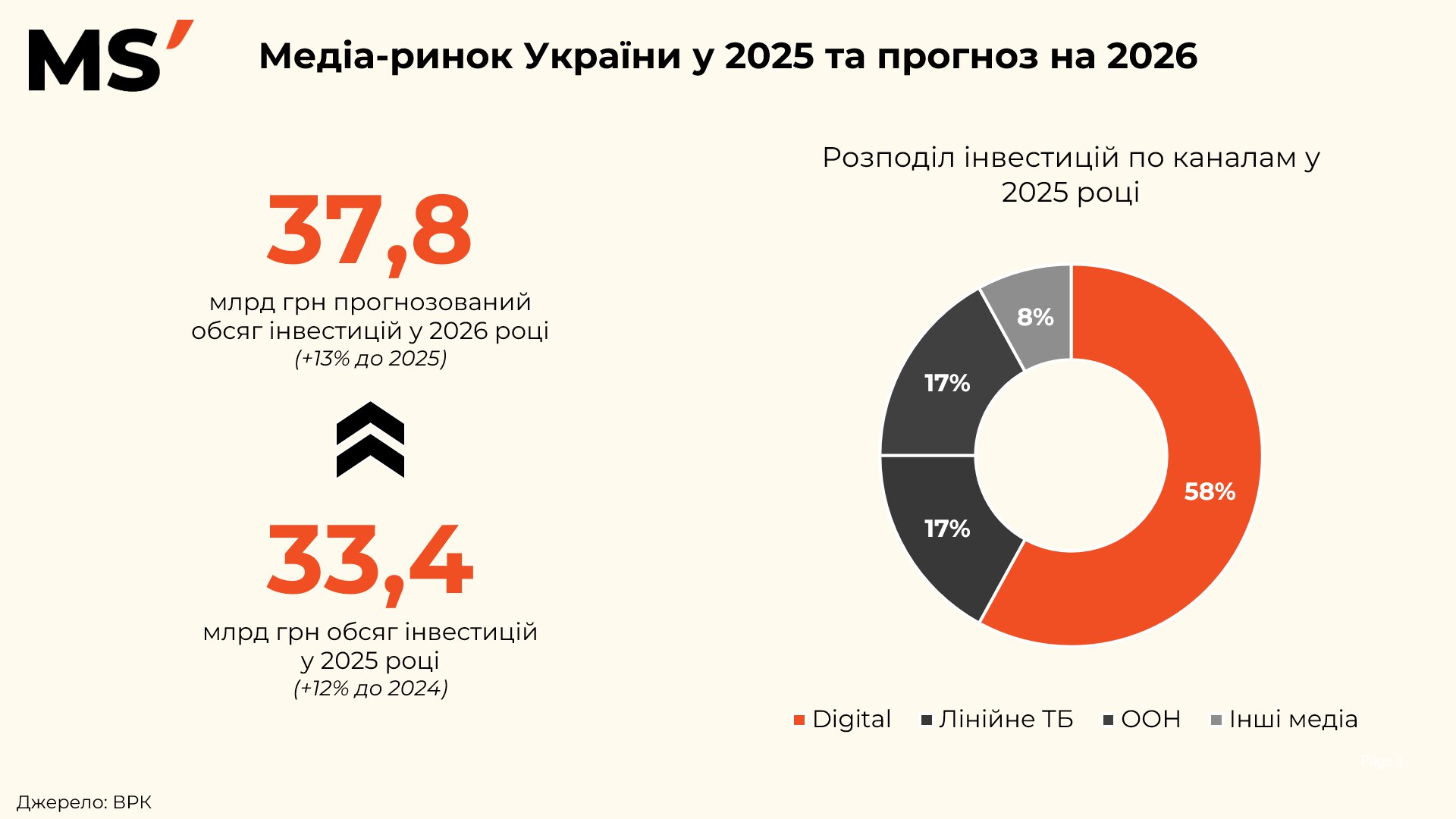 Обсяг медіаінвестицій у 2025 році сягнув 33,4 млрд грн, що на 12% більше, ніж у 2024-му. Прогноз на 2026 рік — 37,8 млрд грн, ще +13% до поточного року. Ринок не просто відновився — він переходить у фазу системного зростання.